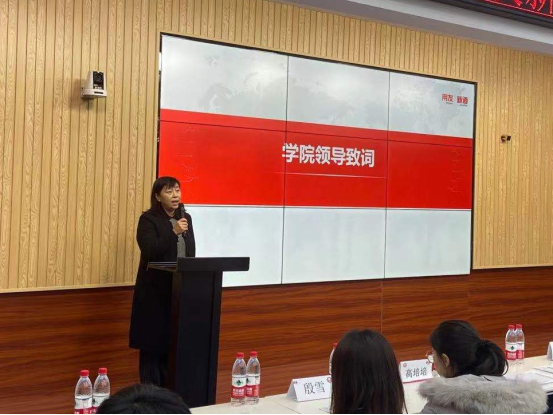 管理学院院长白雪梅首先代表学院致辞。她在致辞中总结了与新道合作三年来所取得的教学成果,特别值得肯定的是在双师双能师资队伍建设、实践教学、技能竞赛、实习就业等方面水平能力和质量的明显提升,社会声誉的不断提高。并表示相信在学校领导的大力支持下,校企双方一定会在总结经验的基础上继续深度合作,积极探索订单订制双主体育人的创新模式,培养出更多更优秀的学生,真正起到引领示范作用。